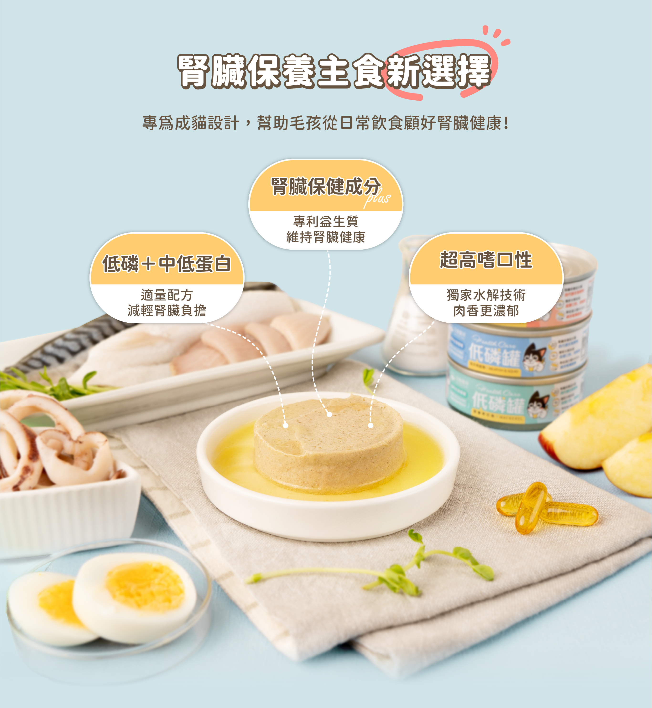 • 低磷+中低蛋白配方,維持腎臟健康